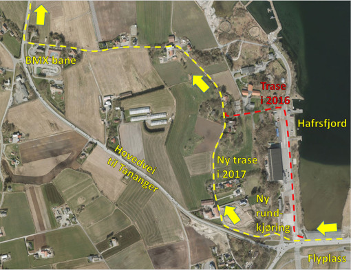 Årets runde har en liten endring ved flyplasen og de hvor den nye store rundtkjøringen er laget. Bildene under viser denne lille omleggingen. Gul strek viser veien i år. Røde streker viser trase i 2016 og 2015. Ikke store endring. Så det er en del av hovedvei til Tanager vi ikke går langs. Et senere år vil det være veien.