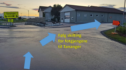 Like etter BMX banen og man svinger høyre mot Tananger, så er det en trasedel hvor man ruller på den tidligere bilveien. Se bildet. Etter noen hundre meter kommer man inn på sykkelstien og alt er som før.